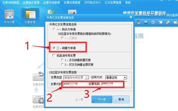 2、選擇銷(xiāo)方申請(qǐng),輸入對(duì)應(yīng)藍(lán)字發(fā)票版代碼和號(hào)碼。權(quán)