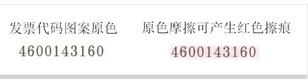 發票各聯次左上方的發票代碼使用防偽油墨印制,油墨印記在外力摩擦作用下可以發生顏色變化,產生紅色擦痕(如下圖所示)。