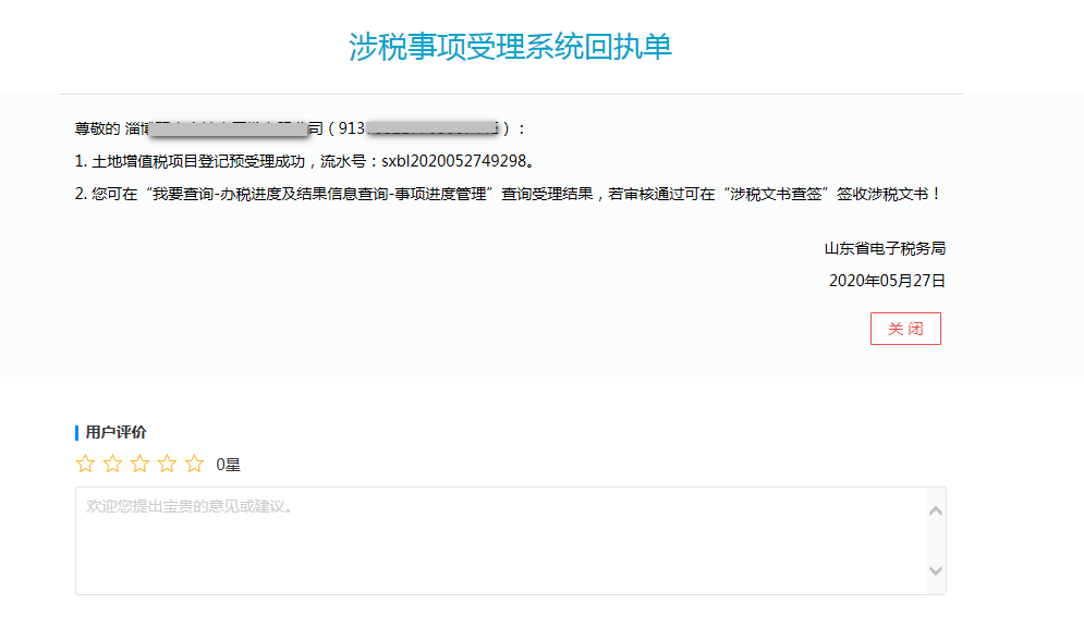 報表填寫完成后,點擊“下一步”按鈕提交局端審核,系統顯示事項受理回執界面。如下圖: